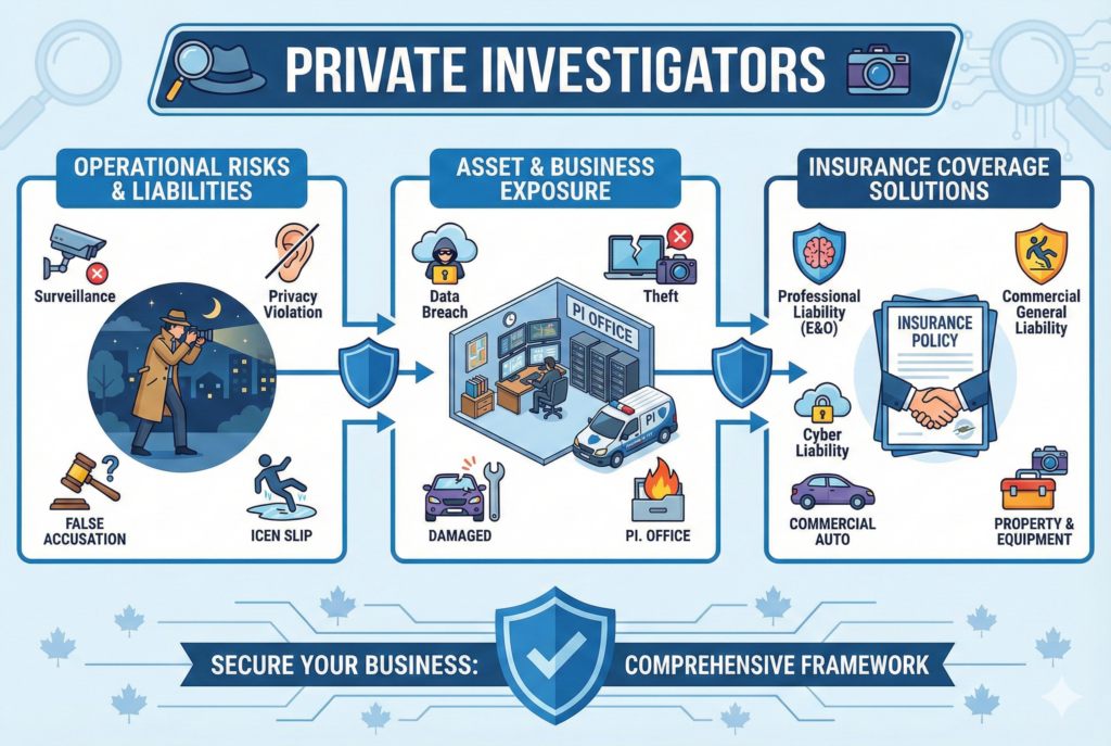 Private investigators (PIs) operate in sensitive, high-stakes environments—handling surveillance, background checks, fraud investigations, and legal support. In Canada, a single misstep can lead to privacy breaches, lawsuits, or criminal allegations, making specialized insurance essential. 🛡️ Key Risks Private Investigators Face Investigative work often involves: Because work involves people and sensitive information, claims can be complex […]